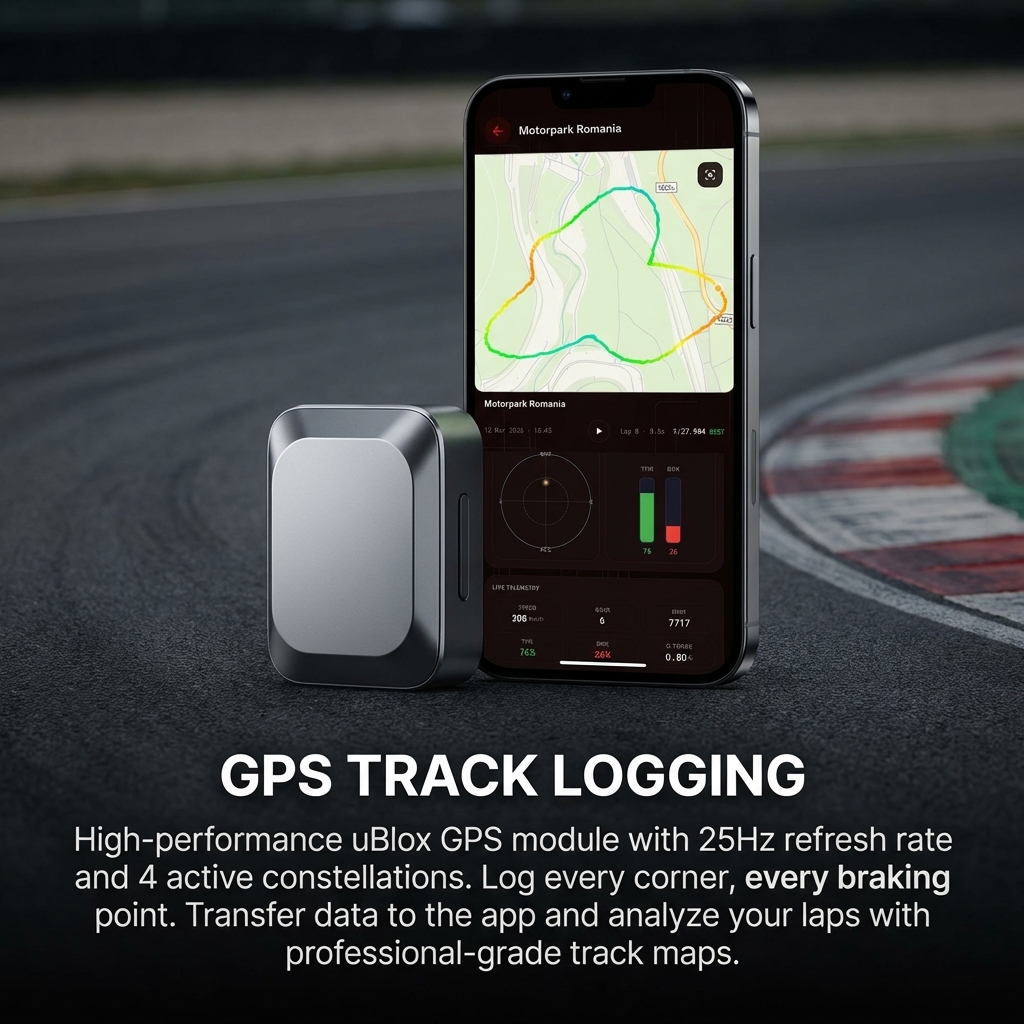 High-performance uBlox GPS module with 25Hz refresh rate and 4 active constellations. Log every corner, every braking point. Transfer data to the app and analyze your laps with professional-grade track maps.