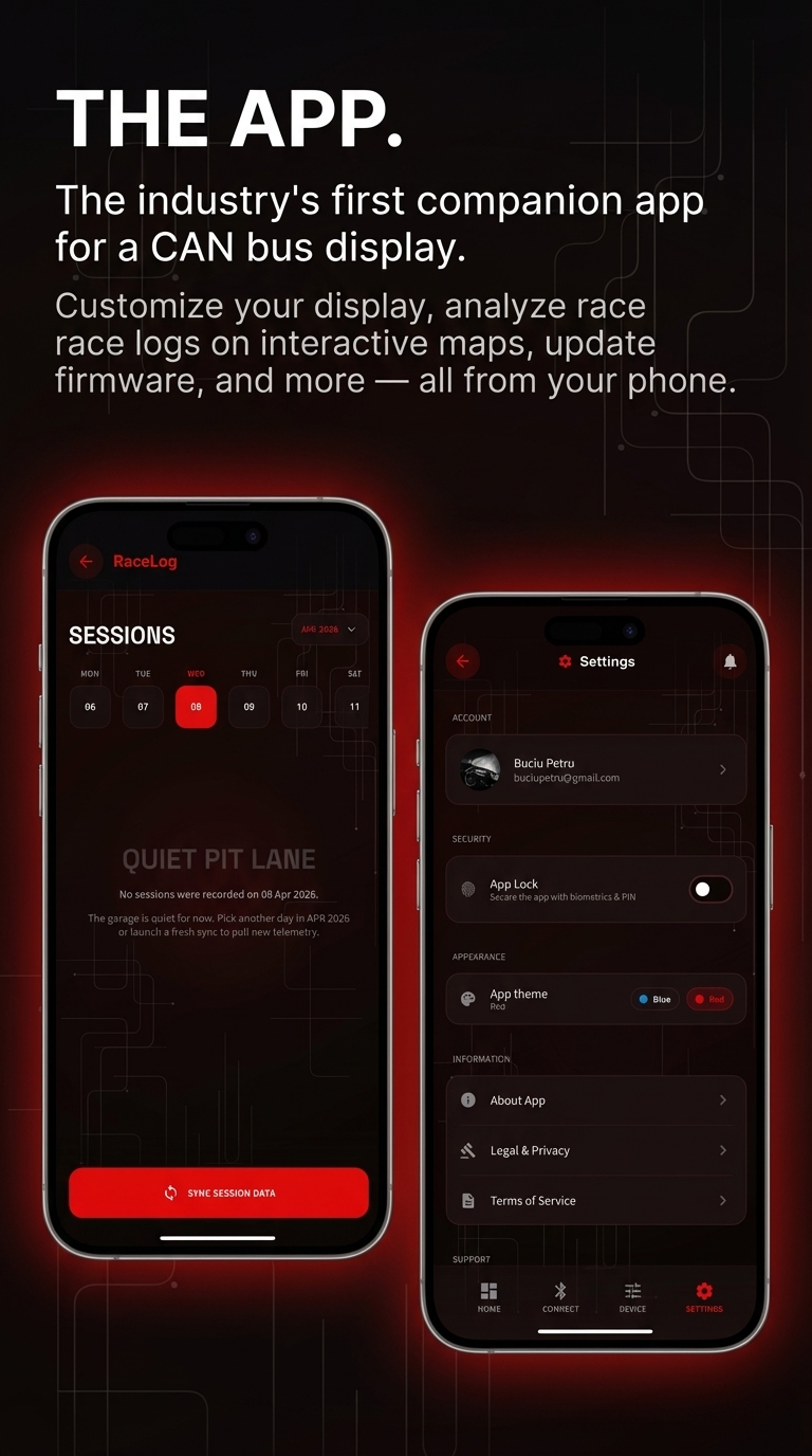 The industry's first companion app for a CAN bus display. Customize your display, analyze race logs on interactive maps, update firmware, and more — all from your phone. Sign in with Google or Apple ID.